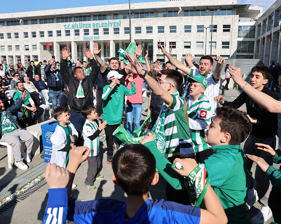 TFF Nesine 2. Lig’de şampiyonluk düğümünün çözüldüğü müsabaka, Nilüfer Belediyesi’nin organizasyonuyla Halk Evi önündeki Cumhuriyet Meydanı’na taşındı. “Omuz Omuza Zafer Yolu” sloganıyla düzenlenen etkinlikte 7’den 70’e yüzlerce yeşil beyazlı takımın sevdalısı tarihi ana tanıklık etti.